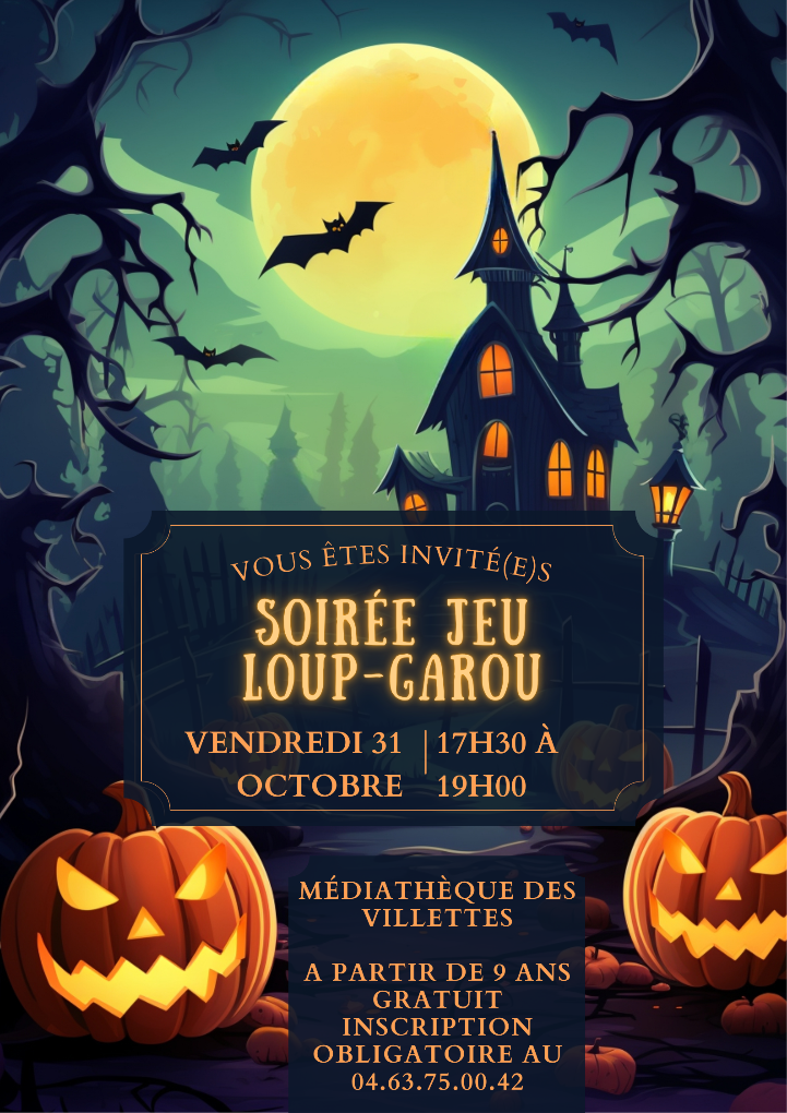Frissons et mystères s’invitent à la médiathèque pour Halloween ! À partir de 9 ans, venez affronter les villageois et les loups-garous lors d’une partie géante du célèbre jeu "Loup-Garou" le vendredi 31 octobre de 17h30 à 19h . Places limitées – inscription obligatoire auprès de la médiathèque 04.63.75.00.42.